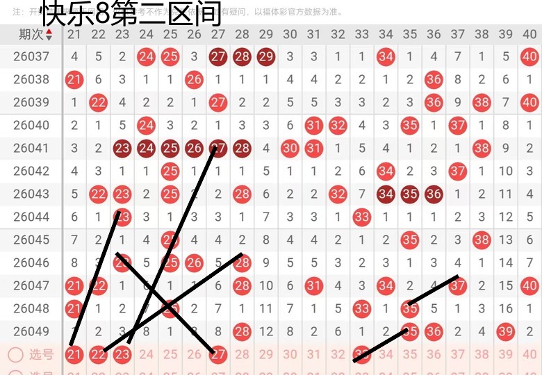 第二区间21,22,23这三个号码的话,还是考虑有一个落位的可能性,因为这三个号码的话,目前为止应该有走两个号的可能性,那么27这个号走到了一个奇数斜连的位置,也是可以考虑的,那么33呢,有一个隔期码的位置还是可以看。