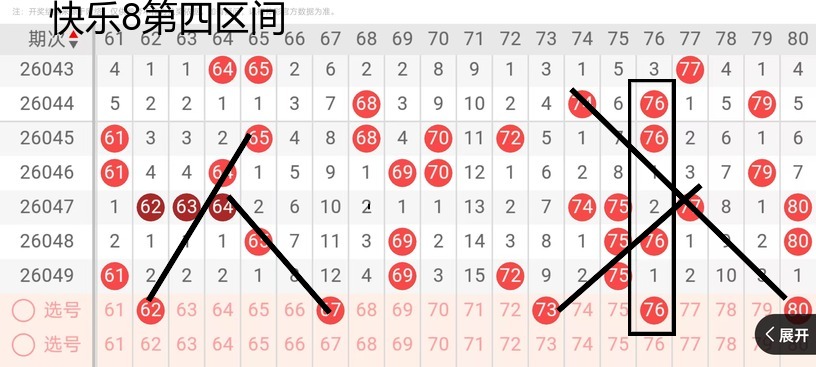第四区间62号,这个位置的话,还是考虑有一个落位,那么67号这个间隔12期的一个走势的话,我本期考虑还是有的,所以说大伙要注意到这个号码的一个落位的可能性,73号这个位置走到一个斜连号的一个遗漏的位置,还是要考虑的76,看了好长时间,感觉这76的话还是有落位的样子,80,这个号码还是要考虑有落位的,因为这个号的话确实走到了一个极致的位置。