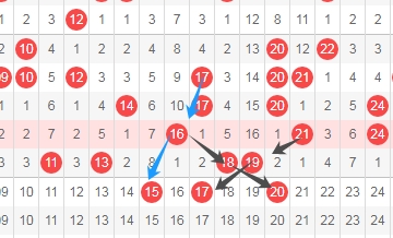 上图是福彩快乐8开奖号码走势分布图其中一部分,我标注出来的数字17 20看黑色小箭头都是跨度二斜连号码,我标注出来的数字15看蓝色箭头是隔一期的斜连号码,这里三个数字15 17 20。