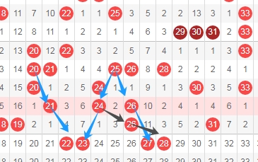 上图是福彩快乐8开奖号码走势分布图其中一部分,我标注出来的数字22 23 27看蓝色小箭头都是隔一期的斜连号码,我标注出来的数字28看黑色小箭头是跨度二斜连号码,这里四个数字22 23 27 28。
