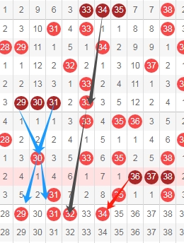 上图是福彩快乐8开奖号码走势分布图其中一部分,我标注出来的数字29 31看蓝色箭头是隔两期的斜连号码,我标注出来的数字32看黑色箭头是隔5期的斜连号码,我标注出来的数字34看红色箭头是斜连号码,这里四个数字29 31 32 34。