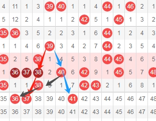 上图是福彩快乐8开奖号码走势分布图其中一部分,我标注出来的数字37看红色箭头是隔一期的斜连号码,我标注出来的数字41看蓝色箭头是隔一期的斜连号码,我标注出来的数字36看黑色箭头是跨度二斜连号码,这里三个数字36 37 41。