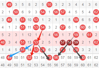 上图是福彩快乐8开奖号码走势分布图其中一部分,我标注出来的数字60 55 56看上面标注出来的黑色箭头都是斜连号码,我标注出来的数字49看蓝色箭头是跨度二斜连号码,我标注出来的数字52看红色箭头是隔一期斜连号码,这里五个数字49 52 55 56 60。
