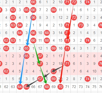 上图是福彩快乐8开奖号码走势分布图其中一部分,我标注出来的数字64看蓝色箭头是隔4期斜连号码,我标注出来的数字65看黑色箭头是跨度二斜连号码,我标注出来的数字68看绿色箭头是隔两期斜连号码,我标注出来的数字70看红色箭头是隔4期斜连号码,这里四个数字64 65 68 70。