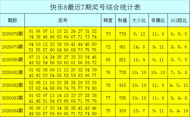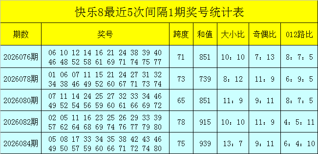 福彩快乐8第2026084期开出奖号:05 08 17 33 34 35 38 42 43 46 49 50 57 59 60 66 71 72 74 80,其中奖号跨度为75,和值为939,大小比为13:7,奇偶比为9:11,012路比为6:4:10。