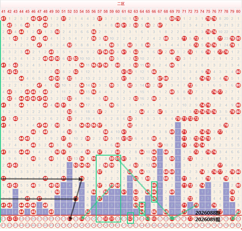 如图所示:在本期大数区的选号中注意在上期的走势中三区间开出了4枚中奖号码,落位在区间的最低位,虽然上期的一区间落号数量出现了低位走势,但是需要注意的上期的一区间开出了49的斜线保持的形态走势,因此本期要注意三区间的落号数量有着较高的可能出现上升走势,重点关注43 47的斜线走势,以及38 40 42或者是39 41 43的奇数单形态走势,二区间尾部位置,以及三区间头部位置,建议考虑多码形态,在5字头的断号走势中,上期仅出现了一枚号码的回补,本期注意54的延续走势,以及52 54的偶数二连,后段位置做防守考虑,四区间上期开出了6枚中奖号码,落位在区间的最高位走势,本期注意66的重号走势,以及如果66走重可能带出连号走势,区间同尾注意69 79的双码走势或者是62 72的同尾双码走势。