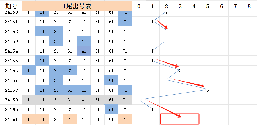 上期一尾开出一码走势,没有直接回补四码走势,那么本期主看开出范围在两码走势至四码走势之间。一尾遗漏2期的号码一共五个,可以考虑开出两码左右。