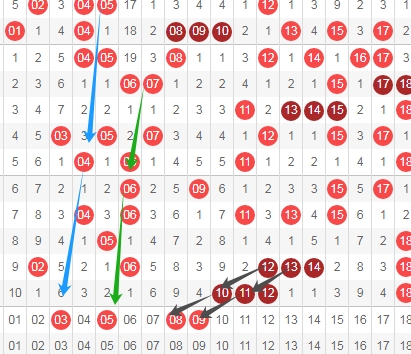 上图是福彩快乐8开奖号码走势分布图其中一部分,我标注出来的数字08 09看黑色箭头是跨度二斜连号码,我标注出来的数字03看蓝色箭头是隔5期斜连号码,我标注出来的数字06看绿色箭头是隔4期斜连号码,这里四个数字03 05 08 09。