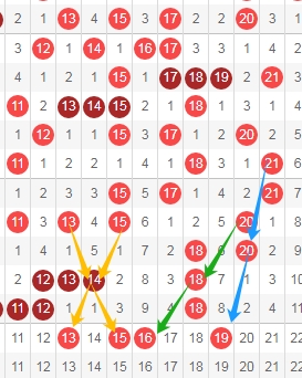 上图是福彩快乐8开奖号码走势分布图其中一部分,我标注出来的数字13 15看黄色箭头是隔一期斜连号码,我标注出来的数字16看绿色箭头是隔一期跨度二斜连号码,我标注出来的数字19看蓝色箭头是隔两期斜连号码,这里四个数字13 15 16 19。