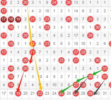 上图是福彩快乐8开奖号码走势分布图其中一部分,我标注出来的数字19看红色箭头是隔两期斜连号码,我标注出来的数字22看黄色箭头是隔4期斜连号码,我标注出来的数字27 29看黑色箭头是跨度二斜连号码,我标注出来的数字25看绿色箭头是跨度二斜连号码,这里五个数字19 22 25 27 29。