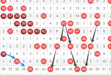 上图是福彩快乐8开奖号码走势分布图其中一部分,我标注出来的数字43 47 48看黑色箭头是隔两期斜连号码,我标注出来的数字40看蓝色箭头是跨度二斜连号码,这里四个数字40 43 47 48。