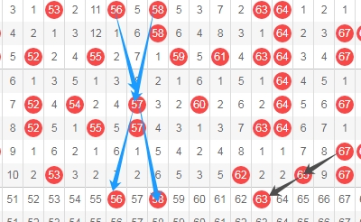 上图是福彩快乐8开奖号码走势分布图其中一部分,我标注出来的数字56 58看蓝色箭头是隔3期斜连号码, 我标注出来的数字63看黑色箭头是跨度二斜连号码,这里三个数字56 58 63。