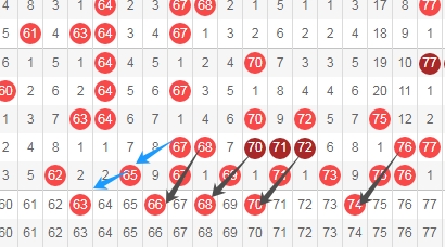 上图是福彩快乐8开奖号码走势分布图其中一部分,我标注出来的数字66 68 70 74看黑色箭头是斜连号码,我标注出来的数字63看蓝色箭头是跨度二斜连号码,这里五个数字63 66 68 70 74。