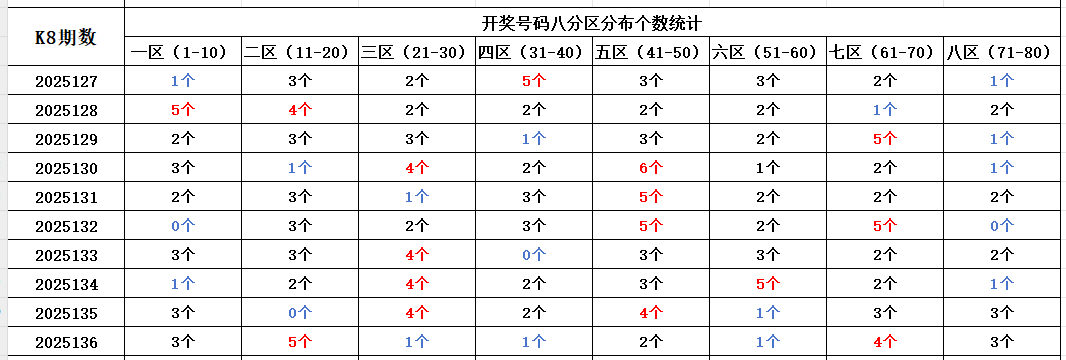 如图,红色字体是热号区,区间开出4个及以上号码。蓝色字体是冷号区,区间开出1个及以下号码。以近10期为一个分析周期,持续走热的区间:五区、七区。持续走冷的区间:四区、八区。依据久热必冷,久冷必热的规律,本期重点关注:二区、五区、七区,区间可能开出3-4个号码。三区、四区、六区,区间可能开出1-2个号码。个人分析,仅供参考。