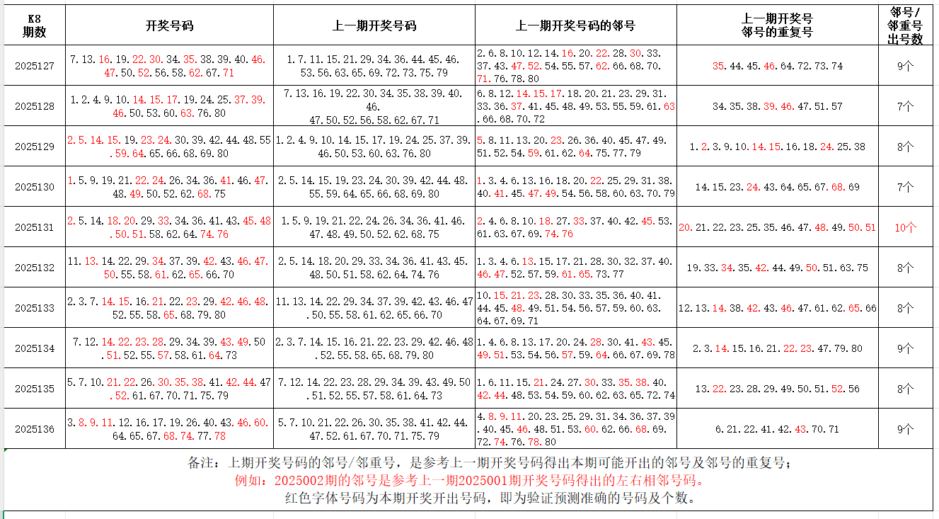 特别提示:有虹友留言,关于邻号和邻重号的数据统计,在此再次赘述:邻号,是指上期开奖号码的左右相邻号码;其中重复出现的邻号,即为邻重号。一定要区分,邻重号不是上期开奖号码的重号,是邻号里的重号。可能新关注的粉丝,还不适应这种统计方法。熟能生巧,无它。统计方法不同,得到的数据结果不同。个人分析,仅供参考。