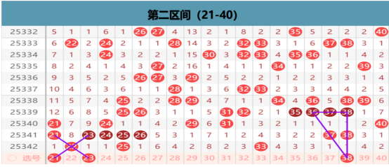本区上期开出3码的区间布局,那么在本期我们优先考虑了的就是区间的同尾的出号点位,22 25的下方我们是要选择一码的下方的出号的位置,优先考虑的还是分边的出号在21 23 24 26的位置上我们做择一的出号的选择,33的下方就不是我们考虑的重点位置了,在空位上我们考虑的回补点位就是就是29 31的位置上我们选择一方下方的出号点位,再37 38的位置上我们也是优先考虑分边位置的出号,36 38的择一选择,那么其他的位置上我们就是做防守出号的可能性了。