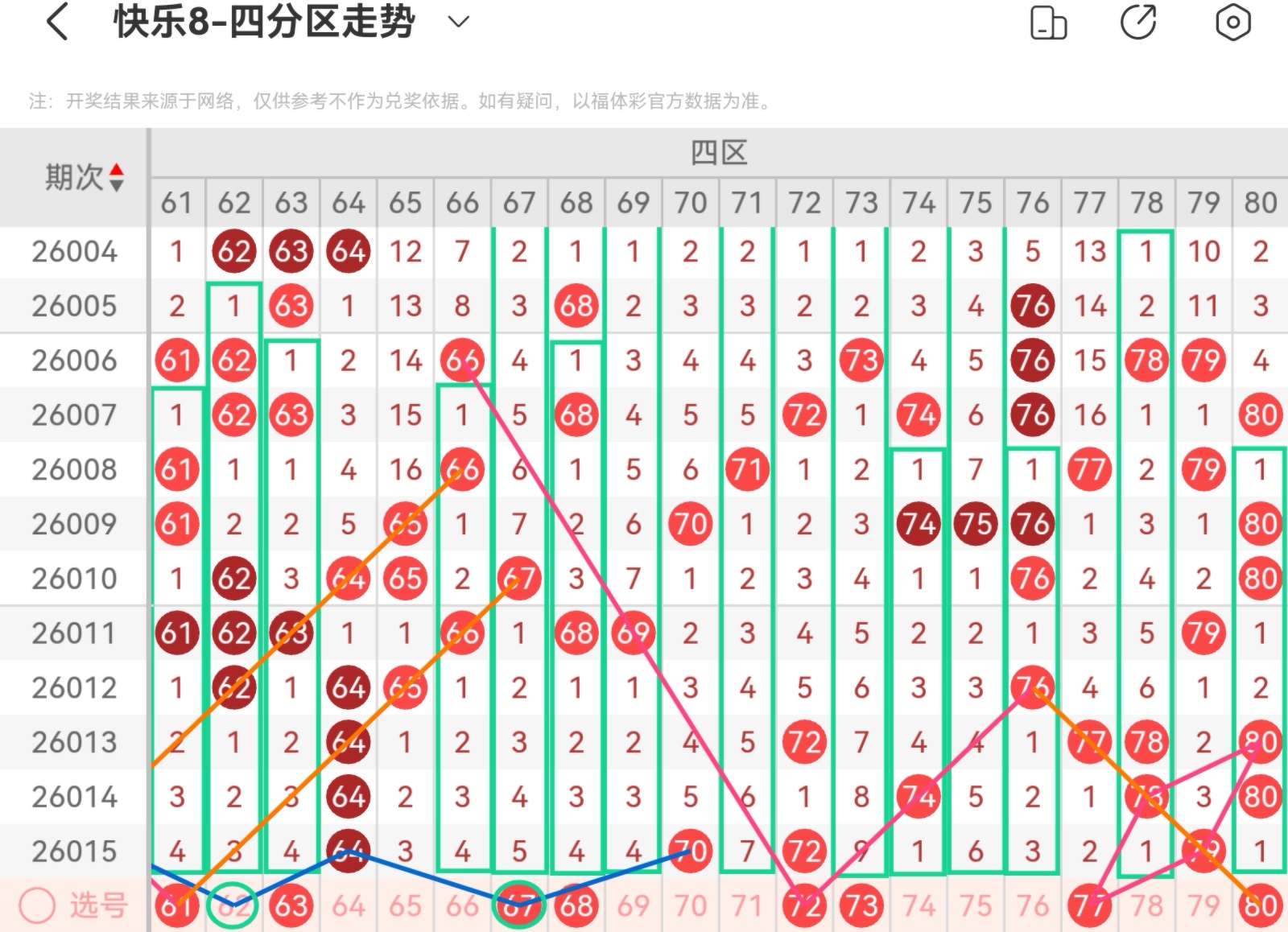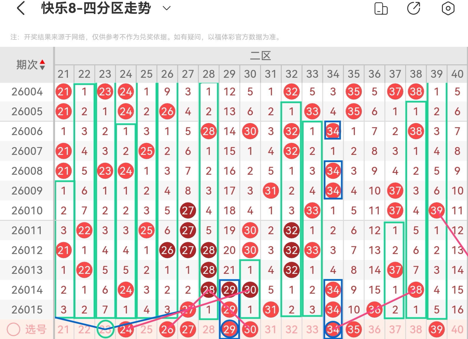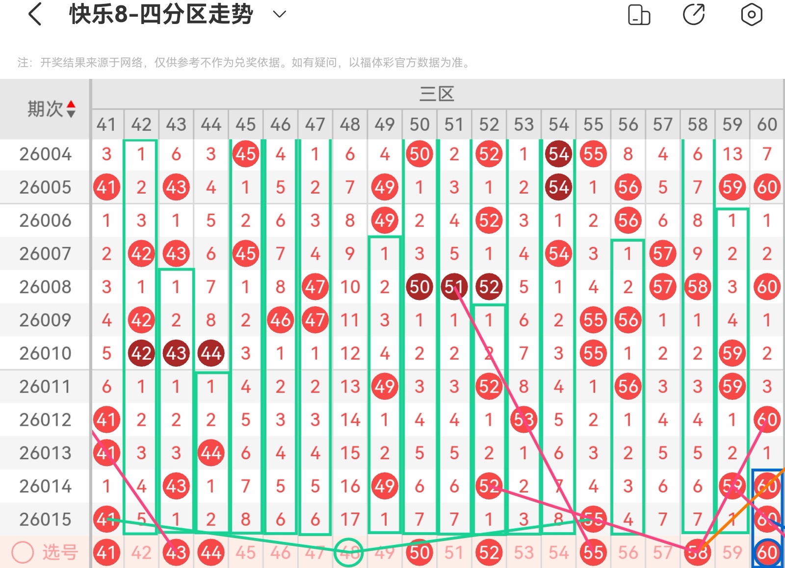 大家好,我是甜丝丝的坏事,主要以快乐八的形态走势、空位走势、遗漏走势以及斜连走势相结合的方法,用公认的四分区走势来进行预测分析,希望能让你有所收获。