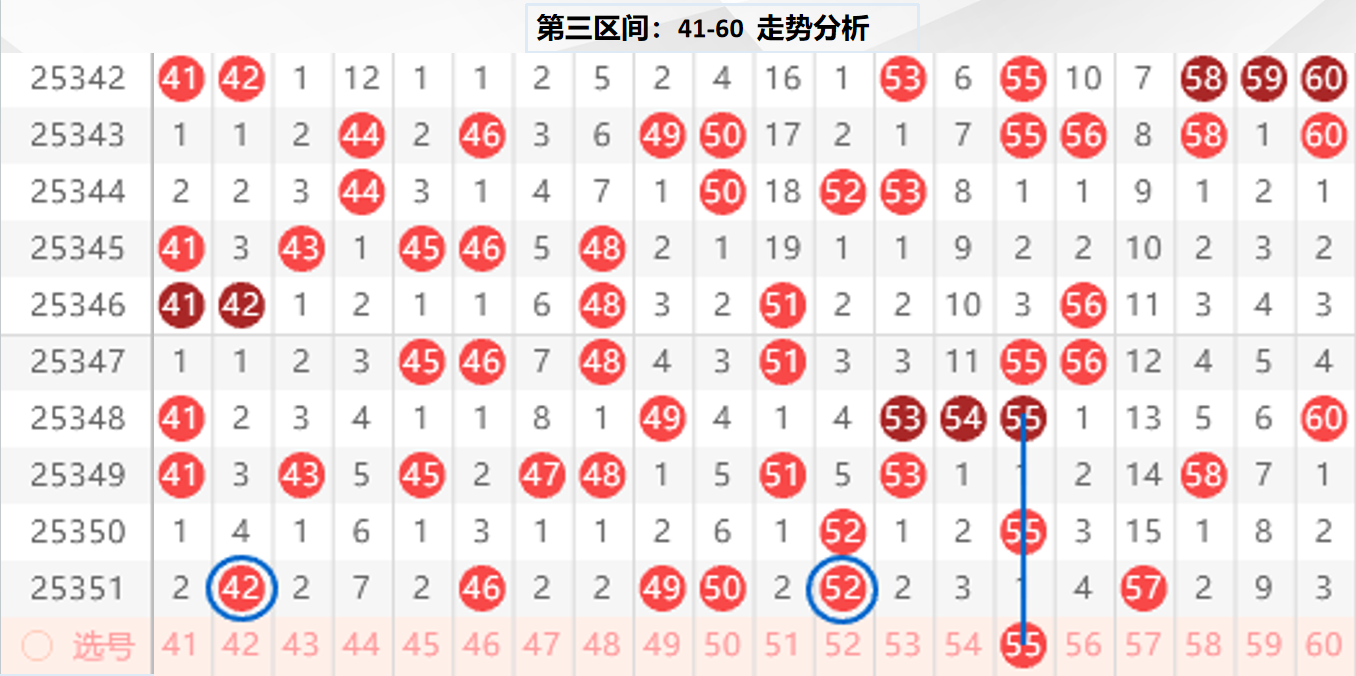 三区分析:【41-60】(走势图标注号码非小黄车大底,请谨慎参考,具体思路将在直播间分享讨论)