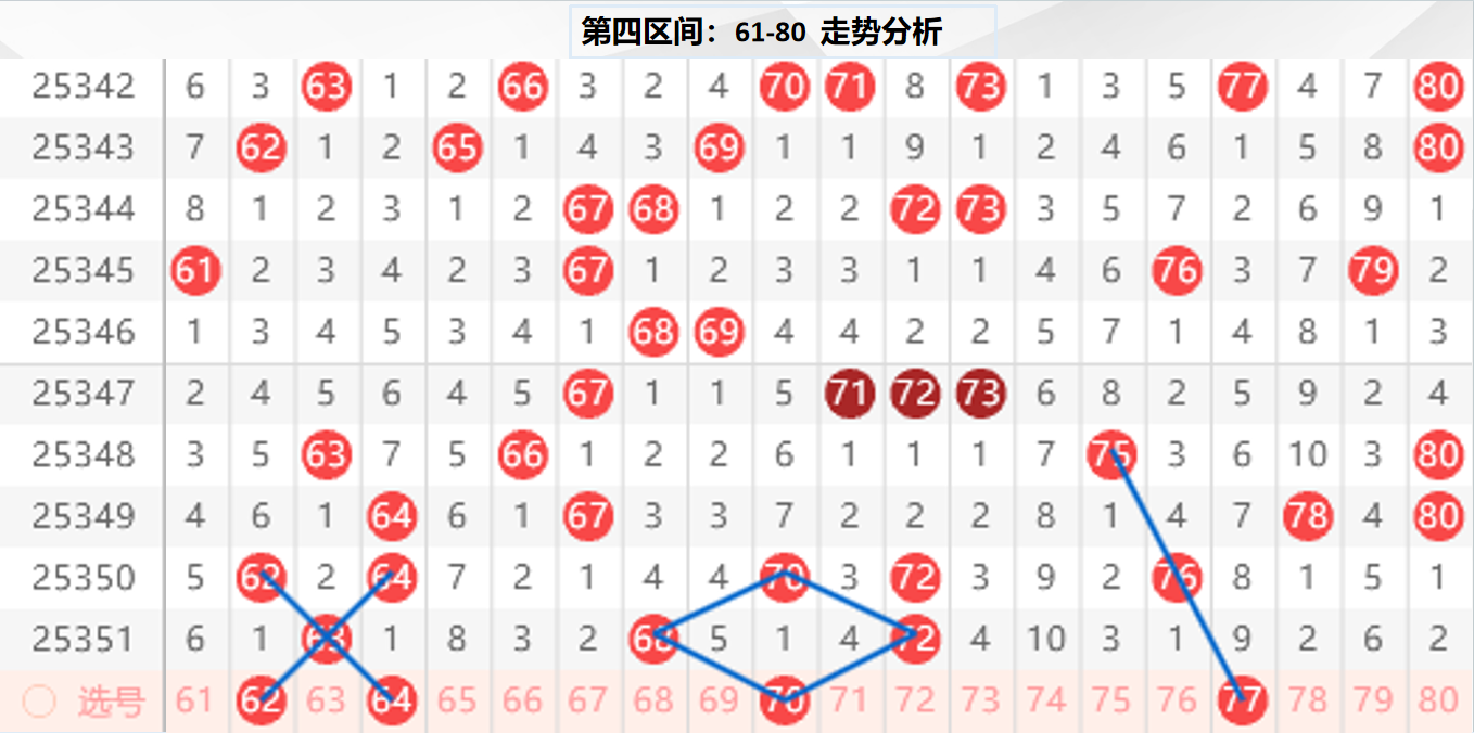 四区分析:【61-80】(走势图标注号码非小黄车大底,请谨慎参考,具体思路将在直播间分享讨论)