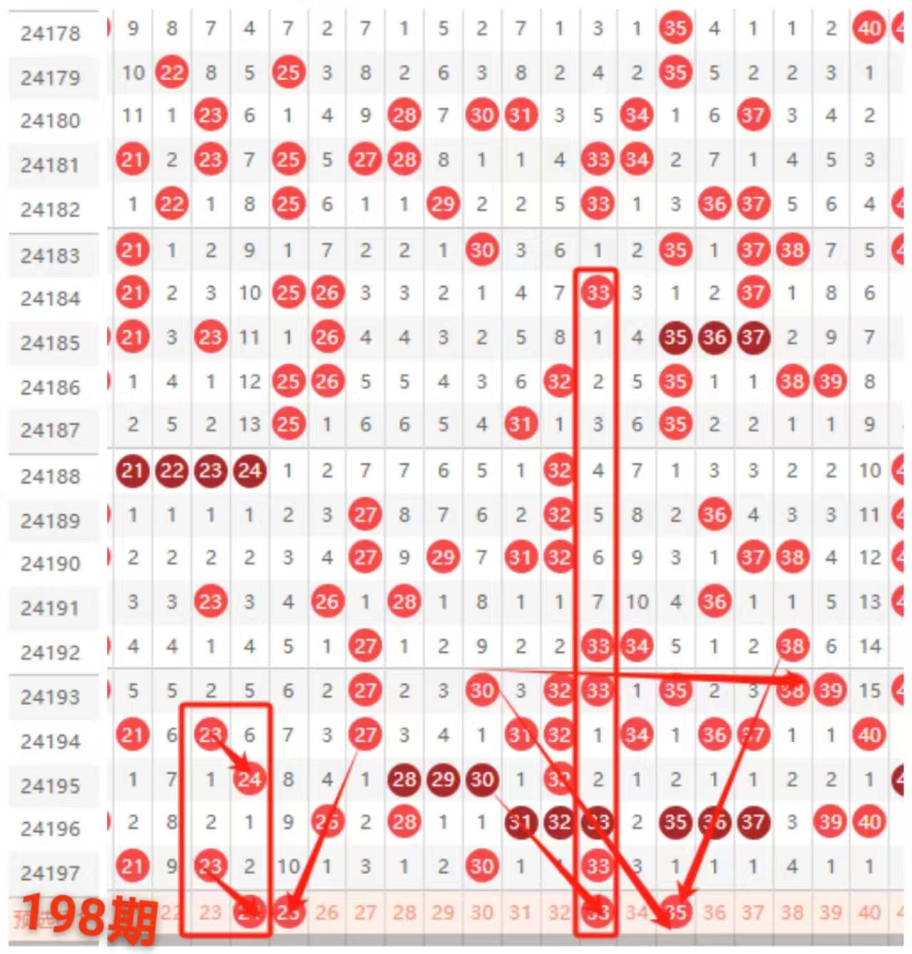 24和25号:这两个号码本期重点关注哈,24号是联动21 23号顺延下落的走势。25号是顺子跳格斜连下落的走势。
