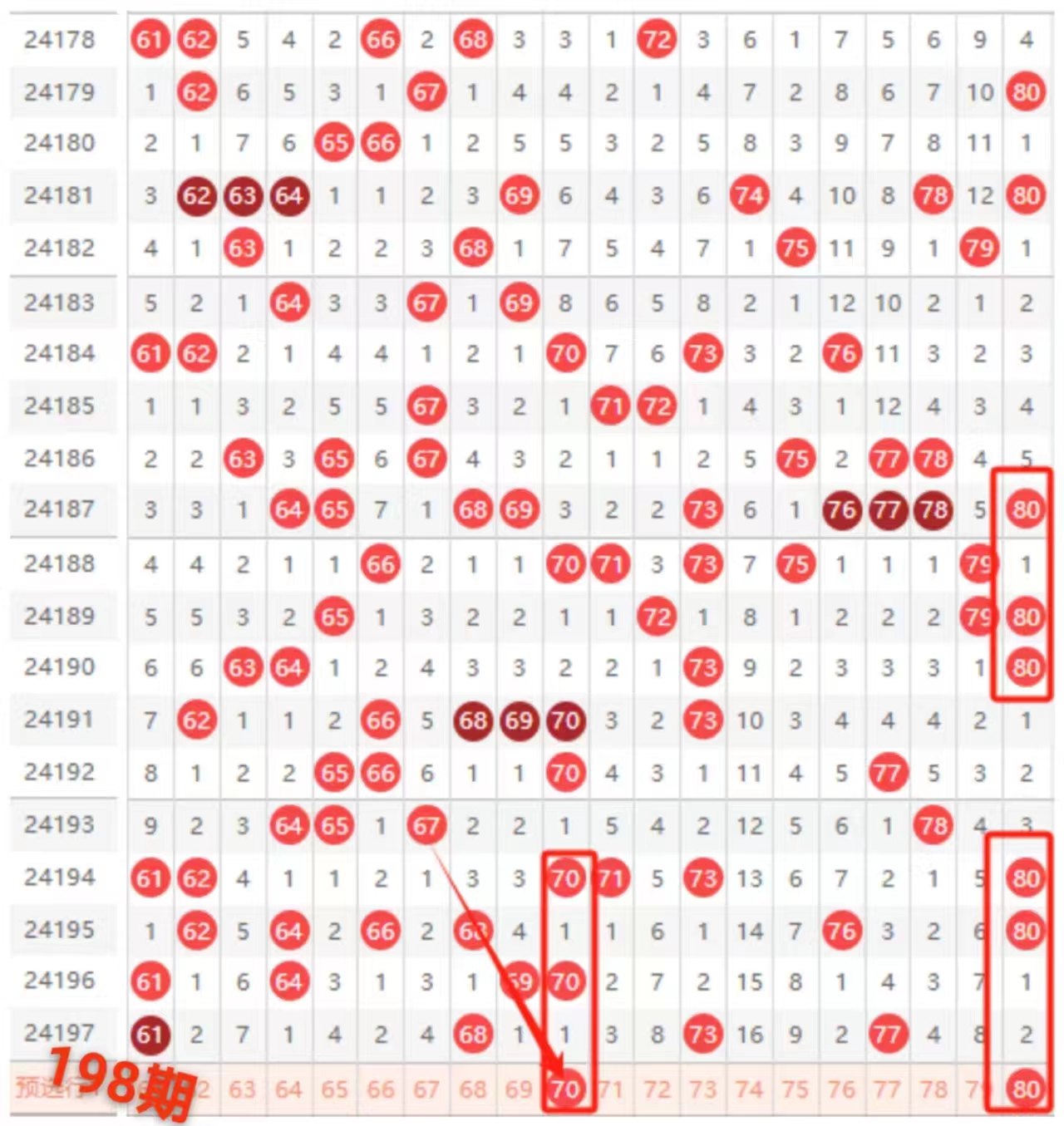70号:这个号码本期是自身跳格对称下落的走势形态。重点关注。