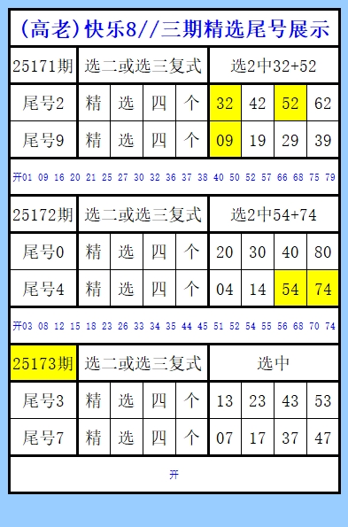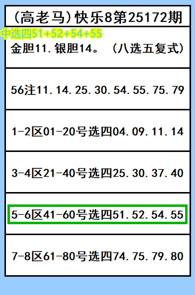 快乐8第173期图文(高老马),精选尾号推荐,视频上期中四51+52+54+55