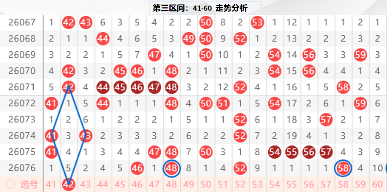 三区分析:【41-60】(走势图标注号码非小黄车大底,请谨慎参考,具体思路将在直播间分享讨论)