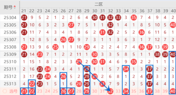 该区间上期开出了22 23号数字,本期我们注意一下出一个重号的情况,其中的22号数字我们可以重点关注一下,本期可以防守一下21 22号数字同出的情况。本期的27号数字是属于三斜连号码,本期出号机会也是有的,我们可以防守一下26 27号数字同出的情况。本期的23 29 37号数字都是属于三重号码,本期我们注意一下出一个四重号的情况,其中的29 37号数字可以重点关注一下出号情况。本期的四连号38 39 40 41号数字已经断号4期了,本期是有机会出一个号码的,其中的39 40号数字我们可以重点关注一下。