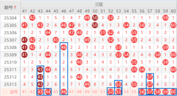 该区间的43号数字我们注意一下出四重号码的情况,本期可以防守一下43 44号数字同出的情况。本期的46号数字跟随号码,出号机会是有的,本期可以防守一下出号情况。上期开出了53 55 57号数字,本期我们注意一下出重号的情况,其中的53 57号数字可以重点关注一下,夹号我们关注一下56号数字的出号情况。本期的58号数字是属于484走势,出号机会是有的,我们可以关注一下出号情况,本期可以防守一下57 58号数字同出的情况。