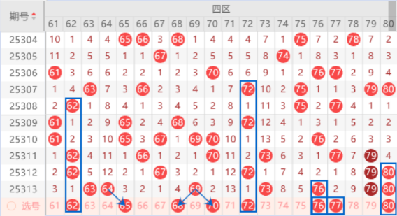 该区间的62号数字是属于421走势,出号机会也是有的,本期的65号数字出号机会也是有的,所以本期的62 65号数字我们可以防守一下同出的情况。本期的68号数字是属于空四对称,本期出号机会是有的,本期我们可以防守一下68 70 72号数字同出的情况,本期的72号数字是属于121走势,出号机会是有的。上期开出了73 76 79 80号数字,本期是有很大机会出一个重号的,其中的76 80号数字可以重点关注一下。
