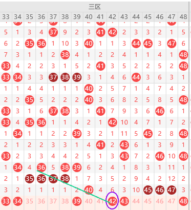 三区看好1尾3尾,隔四期号连出3期本期只有41符合,形态上42是斜连号上图已勾画,本期如果出重号看40,边号39 41 44 48出一码,本期看好3尾回补 33 43二出一,本期关注五码33 39 40 43 48