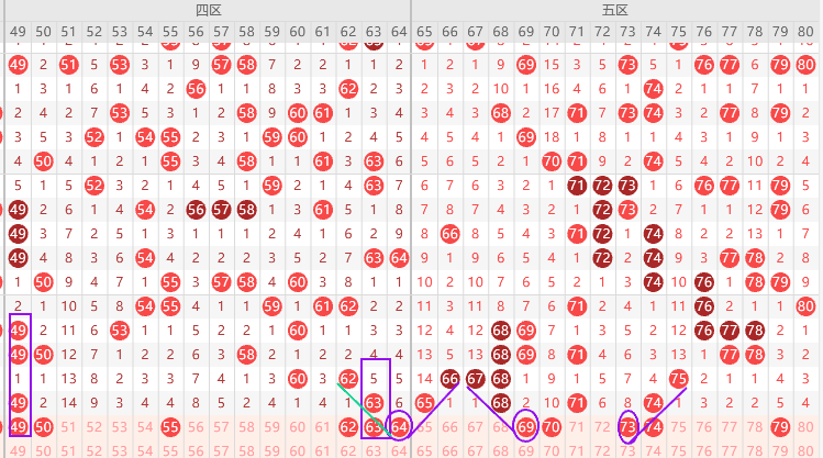 四区胆尾3尾,上期重号没回补,本期如果回补,49 63二出一,63是明号可能63不出出53,其次看边号只有50 62 64要出一码,64是斜连号上图已勾画,本期关注五码49 50 53 62 63防57