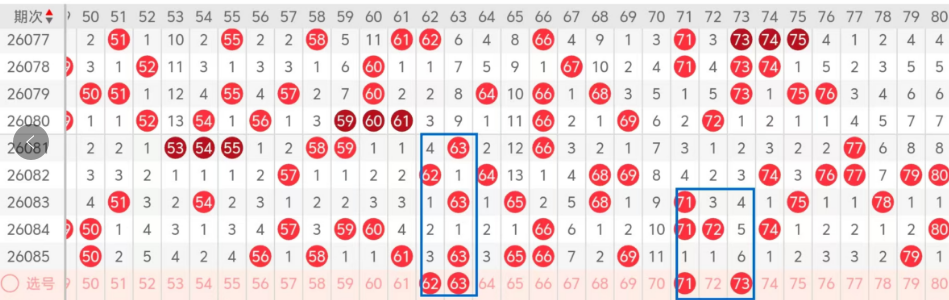 第四区间的走势分析:第四区间上期开出了六个号码球,主要的落号点位在四区间的前半区,走出了五奇一偶的形态走势,上期四区间的前半区落下了五个号码球,后半区落下了一个号码球,整个四区间处于走热的趋势,根据四区间的走势规律,今天的四区间我们主看前半区62 63姊妹对号码的落位,今天落下的机会很大,再看后半区71 73的组合,特别是62 71的组合,63 73的组合,这四个号球建议大家打个四胆拖,或者打个四码复三比较稳妥,参考为主!