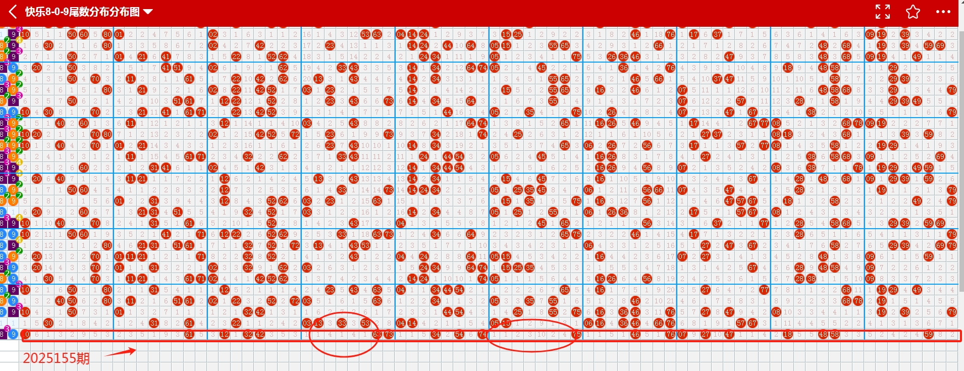 上图是快乐八2025155期的尾码走势图,从图中看0尾到9尾出号个数依次是:0尾号码区开出1个;1尾号码区开出1个;2尾号码区开出3个;3尾号码区开出2个;4尾号码区开出3个;5尾号码区开出1个;6尾号码区开出2个;7尾号码区开出3个;8尾号码区开出3个;9尾号码区开出1个;再看小尾号码(0尾-4尾)区有10码,大尾号有10码;数据比对统计后可以看到2、4、7、8尾出号数量最多,开出了12个中奖号码。本期没有出现断区!由走势比对推断20250156期重点需要关注3、5尾区号码下号热度和增加的概率较大。