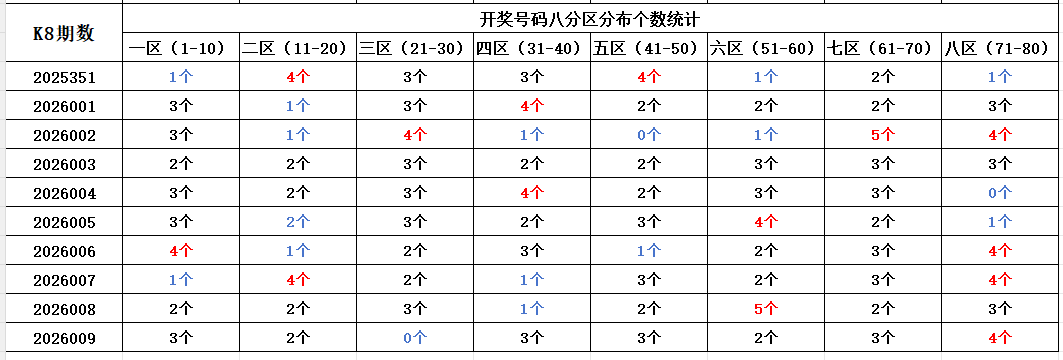 首先看上期回顾,“快乐8”第26009期开奖结果:3.4.8.17.18.31.34.37.42.46.47.55.56.61.65.70.74.75.76.80通过分析开奖号码,分享第一个数据分析:统计开奖号码的八分区冷热走势,判断出号规律。以近10期开奖号码的八分区统计数据为例: