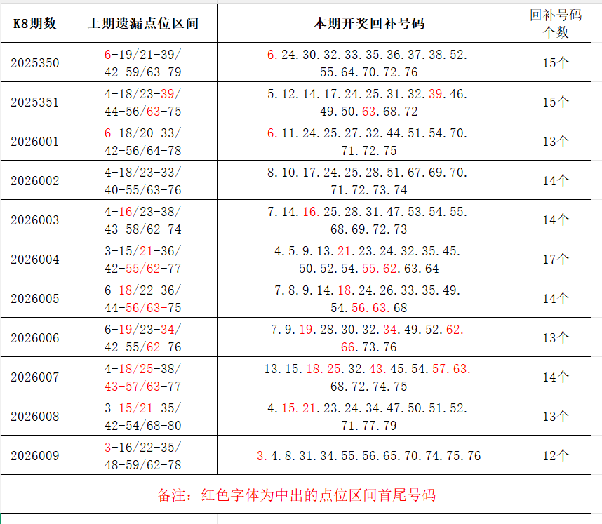 如图,上期的遗漏号码在下期开出10个左右,即为回补号码。定准点位区间首尾号码是关键!以上期2026009期为例,定位4个遗漏区间,围中12码!结合上期开奖号码,以跨度值大于或等于7为依据,本期关注3个遗漏区间:8-17/18-31/47-55;重点关注遗漏区间:3-18/23-38/46-56/62-76。点位区间号码和大底号码请勿混淆,个人分析,仅供参考。