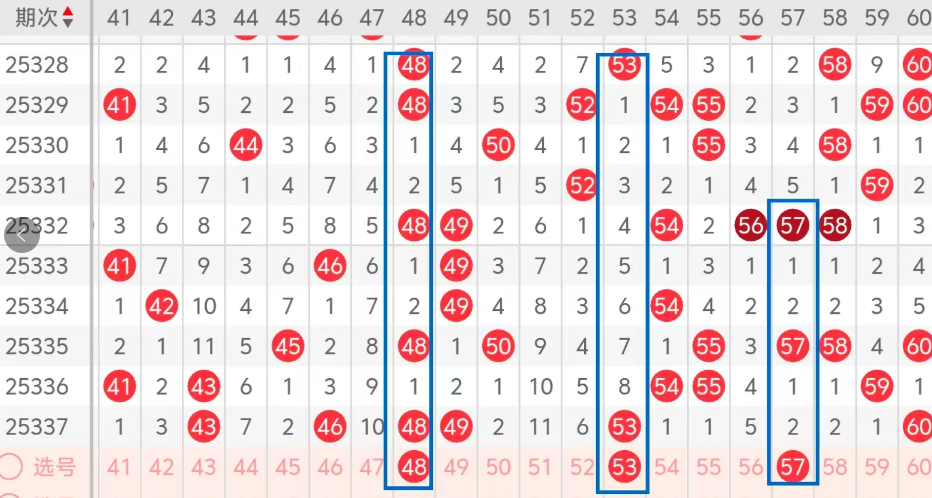 第三区间的走势分析:第三区间上期开出了六个号码球,主要的落号点位在三区间的前半区,走出了三奇三偶的形态走势,上期三区间的前半区落下了四个号码球,后半区落下了两个号码球,整个三区间处于走热的趋势,根据三区间的走势规律,今天的三区间我们主看前半区重码48的落位,走出了对称的形态走势,再看后半区53 57组合的落位,也是热码组合,53走出了重码的走势形态,57走出了对称的形态走势,这三个号码球落下两码的机会很大,建议大家打个三码复二较稳妥,参考为主!