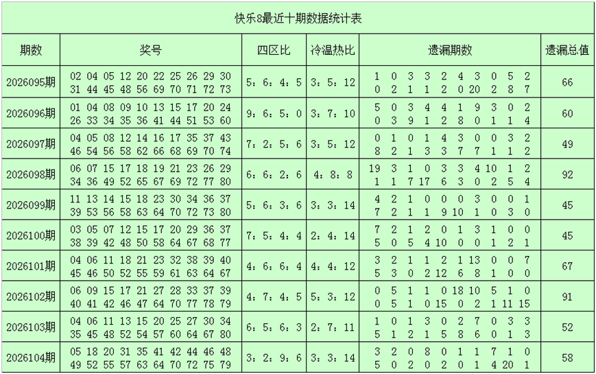 一、快乐8第2026105期奖号分析(定义:遗漏0-2期号码为热码,遗漏3-6期号码为温码,遗漏7期及7期以上号码为冷码,重码为上期开出奖号,邻码为上期没有出现,但与上期奖号差值为1的号码,例如上期开出奖号04,没有出现号码03和05,则本期03和05都为邻码,其它则为孤码。