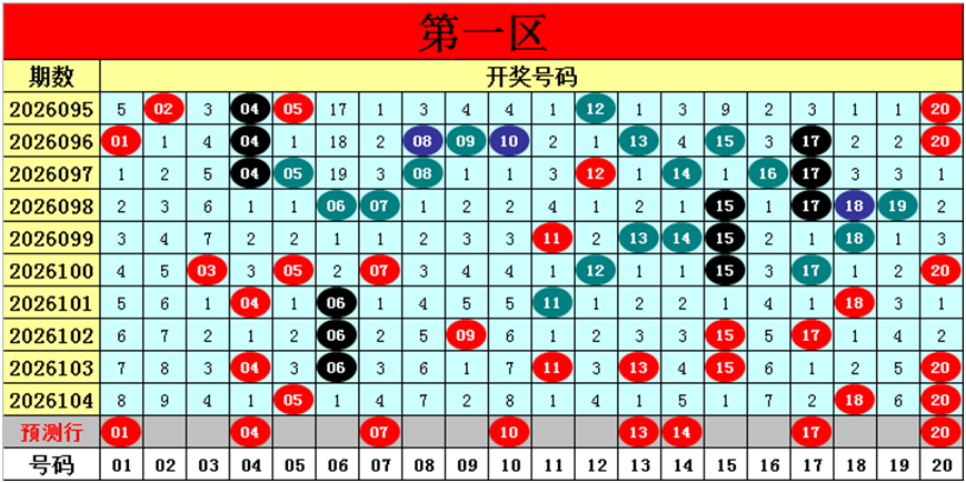 目前第一区包含10个热码:重码3个05、18、20,邻码3个04、06、17,孤码4个09、11、13、15;包含5个温码:邻码1个19,孤码4个03、07、12、14;包含5个冷码:邻码0个,孤码5个01、02、08、10、16;号码冷温热个数比为5:5:10,重号、邻码、孤码个数比为3:4:13。