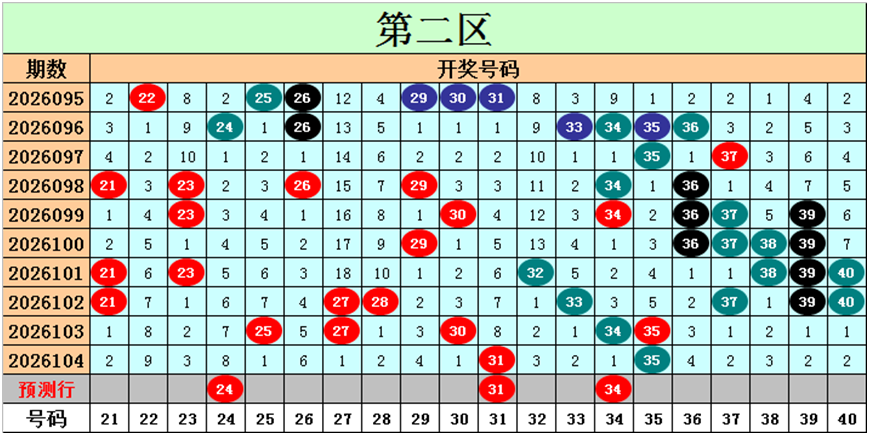 目前第二区包含12个热码:重码2个31、35,邻码4个21、30、34、40,孤码6个25、27、28、33、37、39;包含6个温码:邻码2个32、36,孤码4个23、26、29、38;包含2个冷码:邻码0个,孤码2个22、24;号码冷温热个数比为2:6:12,重号、邻码、孤码个数比为2:6:12。