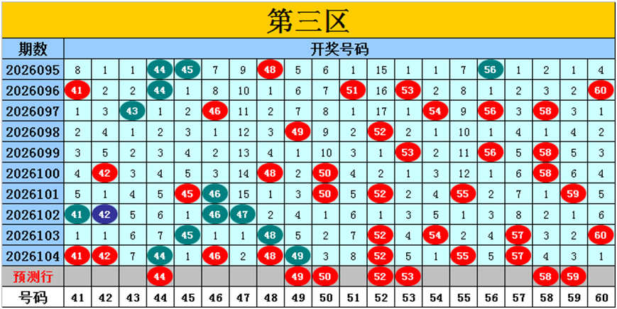 目前第三区包含13个热码:重码9个41、42、44、46、48、49、52、55、57,邻码3个45、47、54,孤码1个60;包含5个温码:邻码4个50、53、56、58,孤码1个59;包含2个冷码:邻码2个43、51,孤码0个;号码冷温热个数比为2:5:13,重号、邻码、孤码个数比为9:9:2。