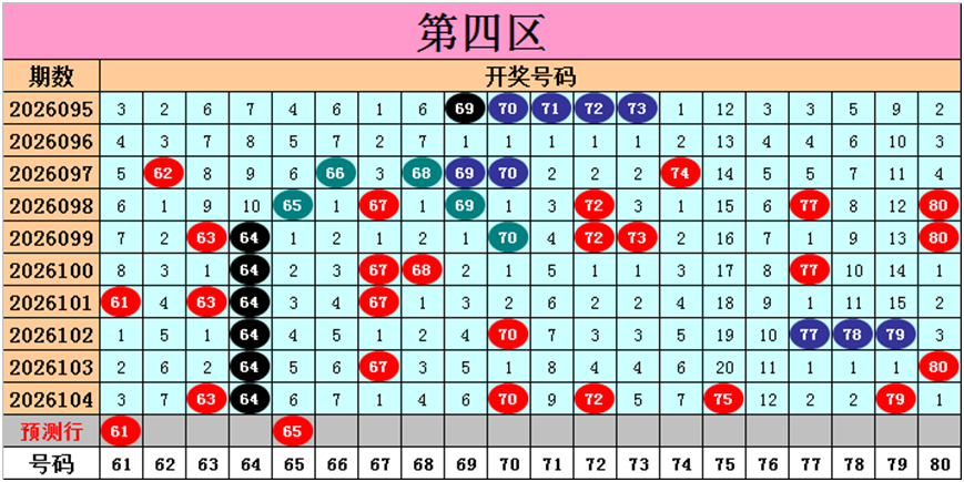 目前第四区包含10个热码:重码6个63、64、70、72、75、79,邻码2个78、80,孤码2个67、77;包含5个温码:邻码3个65、69、73,孤码2个61、68;包含5个冷码:邻码4个62、71、74、76,孤码1个66;号码冷温热个数比为5:5:10,重号、邻码、孤码个数比为6:9:5。