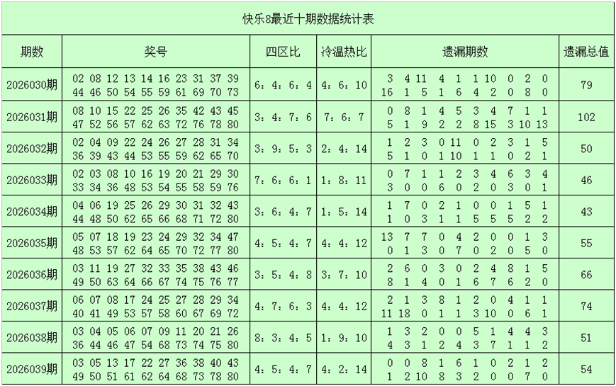 一、快乐8第2026040期奖号分析(定义:遗漏0-2期号码为热码,遗漏3-6期号码为温码,遗漏7期及7期以上号码为冷码,重码为上期开出奖号,邻码为上期没有出现,但与上期奖号差值为1的号码,例如上期开出奖号04,没有出现号码03和05,则本期03和05都为邻码,其它则为孤码。