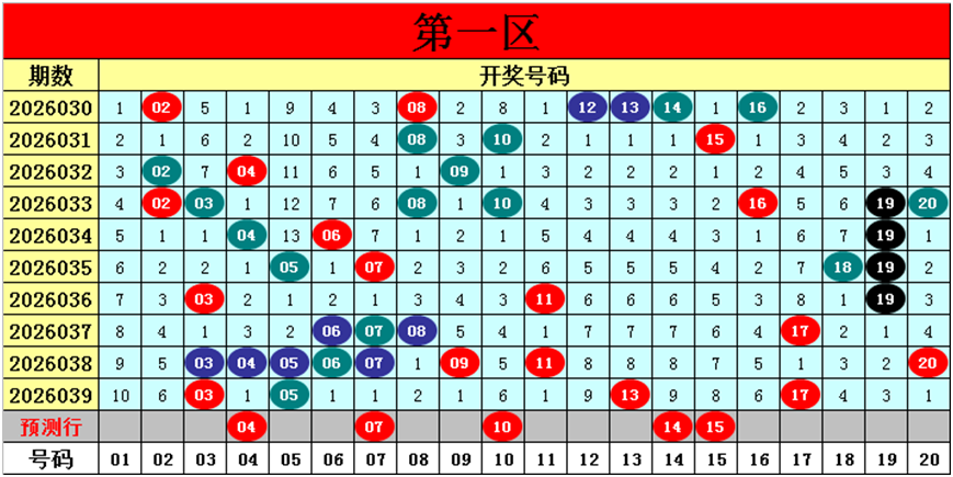 目前第一区包含11个热码:重码4个03、05、13、17,邻码2个04、06,孤码5个07、08、09、11、20;包含5个温码:邻码3个02、16、18,孤码2个10、19;包含4个冷码:邻码2个12、14,孤码2个01、15;号码冷温热个数比为4:5:11,重号、邻码、孤码个数比为4:7:9。