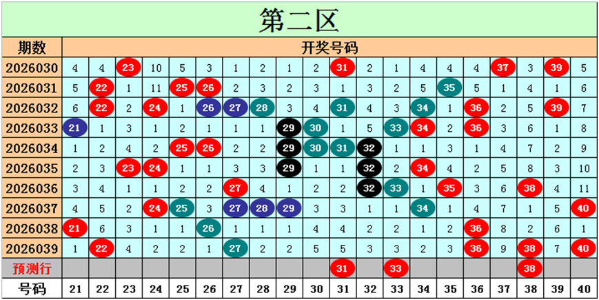 目前第二区包含12个热码:重码5个22、27、36、38、40,邻码3个21、26、28,孤码4个24、25、29、34;包含6个温码:邻码2个23、35,孤码4个30、31、32、33;包含2个冷码:邻码2个37、39,孤码0个;号码冷温热个数比为2:6:12,重号、邻码、孤码个数比为5:7:8。