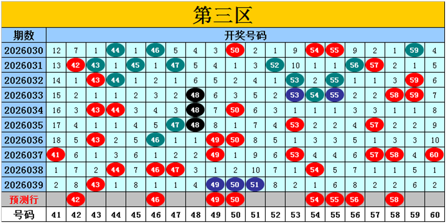 目前第三区包含13个热码:重码4个43、49、50、51,邻码3个41、44、60,孤码6个46、47、53、54、57、58;包含3个温码:邻码1个48,孤码2个55、59;包含4个冷码:邻码2个42、52,孤码2个45、56;号码冷温热个数比为4:3:13,重号、邻码、孤码个数比为4:6:10。