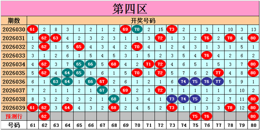 目前第四区包含12个热码:重码7个61、62、64、68、73、78、80,邻码4个67、69、72、74,孤码1个75;包含7个温码:邻码3个63、65、77,孤码4个66、70、71、76;包含1个冷码:邻码1个79,孤码0个;号码冷温热个数比为1:7:12,重号、邻码、孤码个数比为7:8:5。