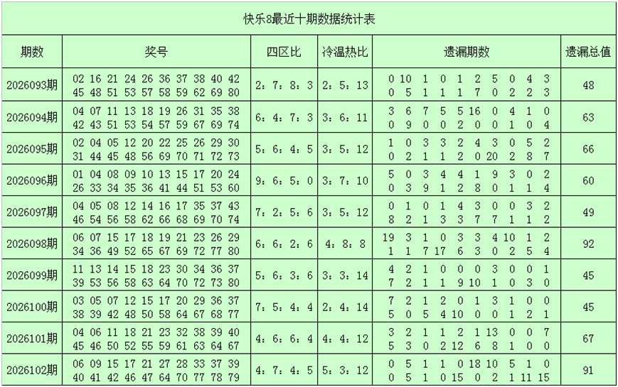一、快乐8第2026103期奖号分析(定义:遗漏0-2期号码为热码,遗漏3-6期号码为温码,遗漏7期及7期以上号码为冷码,重码为上期开出奖号,邻码为上期没有出现,但与上期奖号差值为1的号码,例如上期开出奖号04,没有出现号码03和05,则本期03和05都为邻码,其它则为孤码。