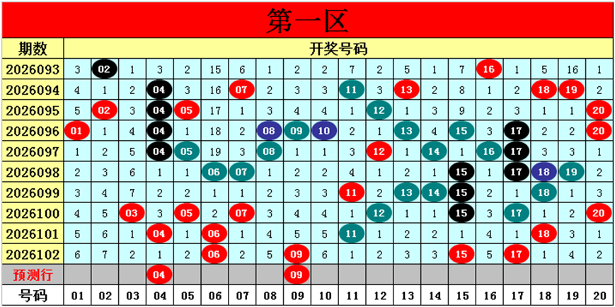 目前第一区包含12个热码:重码4个06、09、15、17,邻码4个05、07、18、20,孤码4个03、04、11、12;包含7个温码:邻码4个08、10、14、16,孤码3个01、13、19;包含1个冷码:邻码0个,孤码1个02;号码冷温热个数比为1:7:12,重号、邻码、孤码个数比为4:8:8。