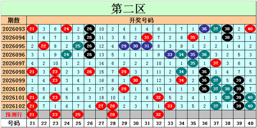 目前第二区包含12个热码:重码7个21、27、28、33、37、39、40,邻码4个29、32、36、38,孤码1个23;包含5个温码:邻码2个26、34,孤码3个24、30、35;包含3个冷码:邻码1个22,孤码2个25、31;号码冷温热个数比为3:5:12,重号、邻码、孤码个数比为7:7:6。